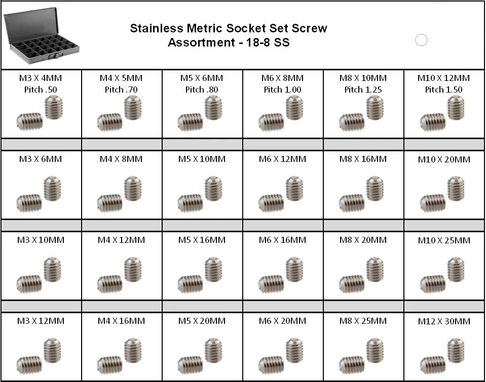Stainless Metric Socket Set Screw Assortment in 24 Hole Locking Metal Tray - 18-8 SS