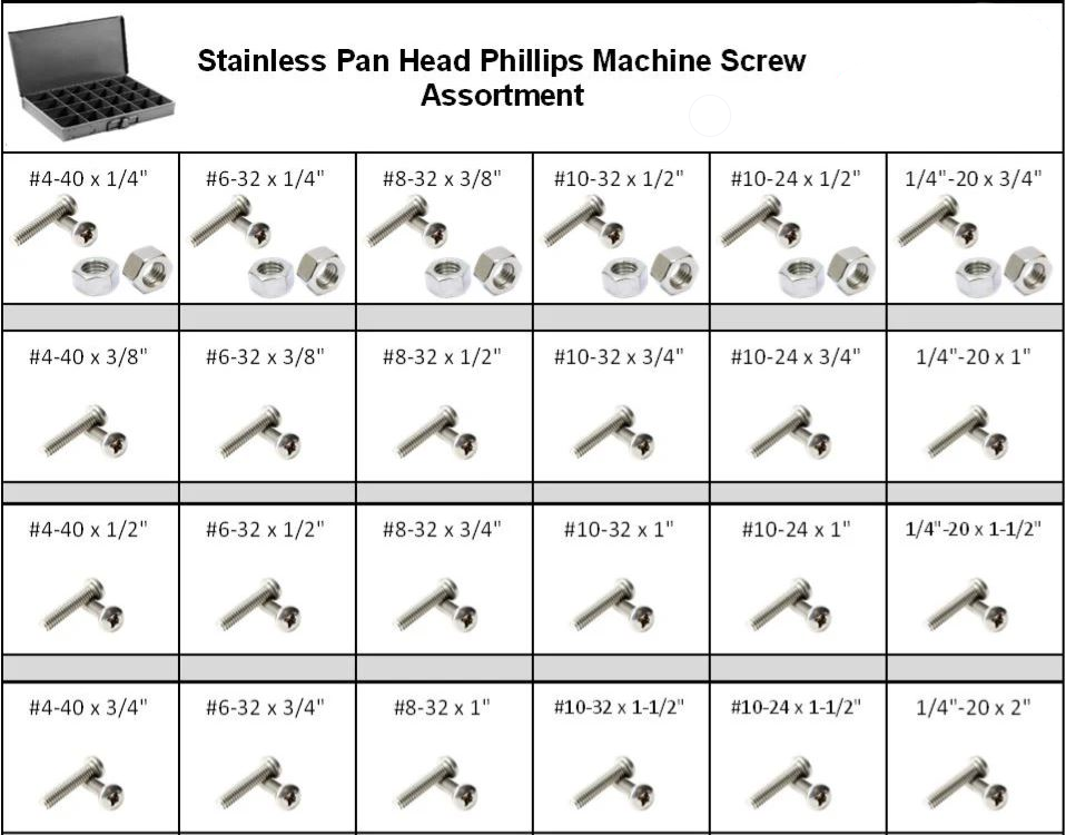 Stainless Pan Head Phillips Machine Screw Assortment in 24 Hole Locking Metal Tray Kit - 18-8 SS